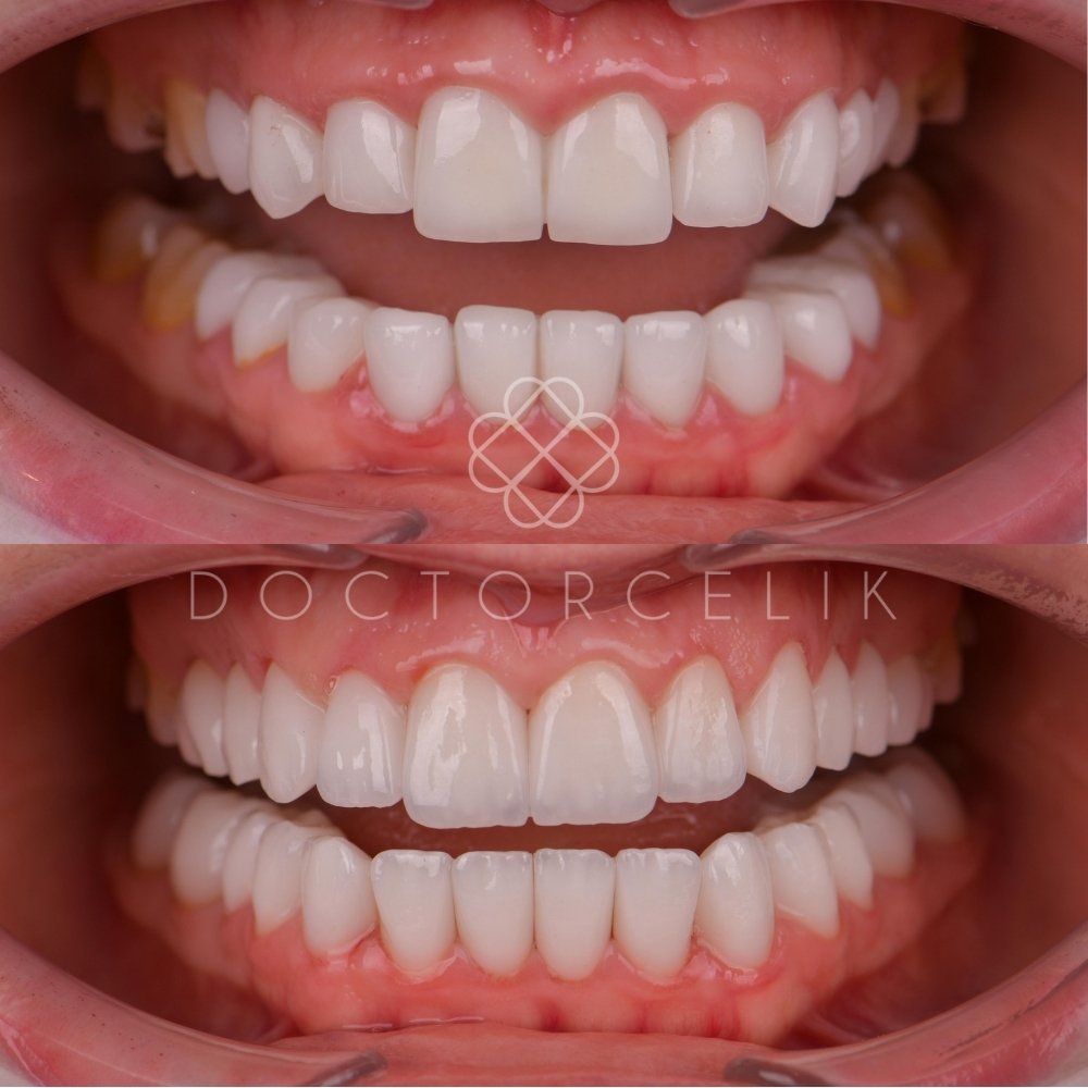 This patient came to our clinic with 20 porcelain veneers that had been placed six years ago in another practice. Her main concerns were inflamed and irritated gums, especially around the cervical margins, bulky and asymmetric veneers that did not match her facial proportions, and the loss of natural translucency that created an overall “aged” appearance of the smile. She also reported functional discomfort, particularly during speaking and biting.