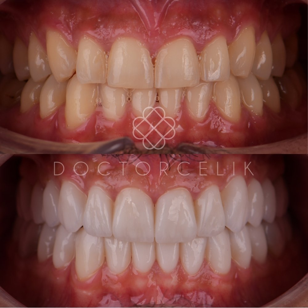 First, a detailed clinical examination was performed. The patient received subgingival curettage and professional cleaning to restore gingival health. The old crowns were removed because they were causing irritation and contributing to plaque accumulation and gum inflammation.